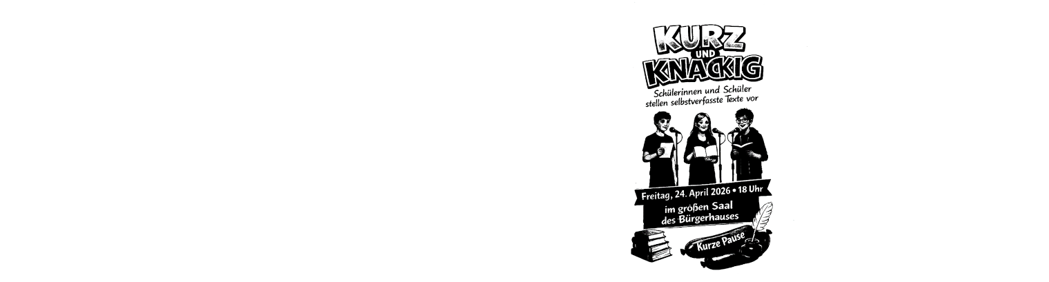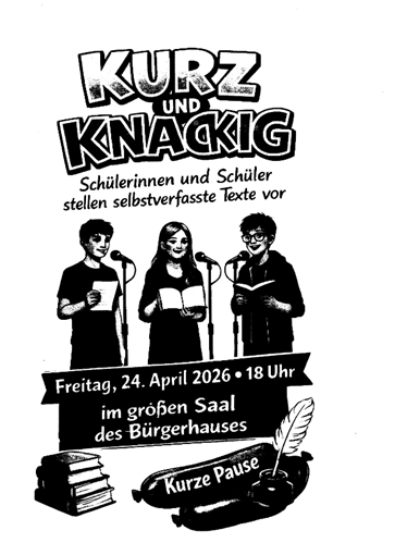 Am 24.04.2026 findet im großen Saal des Bürgerhauses ein Literaturevent, an dem auch junge Autorinnen und Autoren unserer Schule und der HSS beteiligt sind, statt. Zu dieser Veranstaltung laden wir alle Interessierten auch im Namen der Buchhandlung Blume, die das Format „Kurz und Knackig“ ins Leben gerufen hat, ein. Ab 18.00 Uhr stellen unsere Schülerinnen und Schüler ihre selbstverfassten Texte vor und freuen sich auf ein interessiertes Publikum!